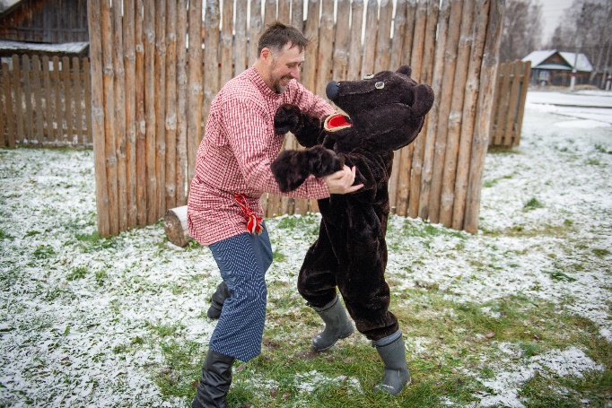 Встречайте задорных скоморохов, которые будут развлекать вас своими выступлениями, играми и песнями, создавая атмосферу настоящего народного гуляния. - Учёный медведь (ряженый):